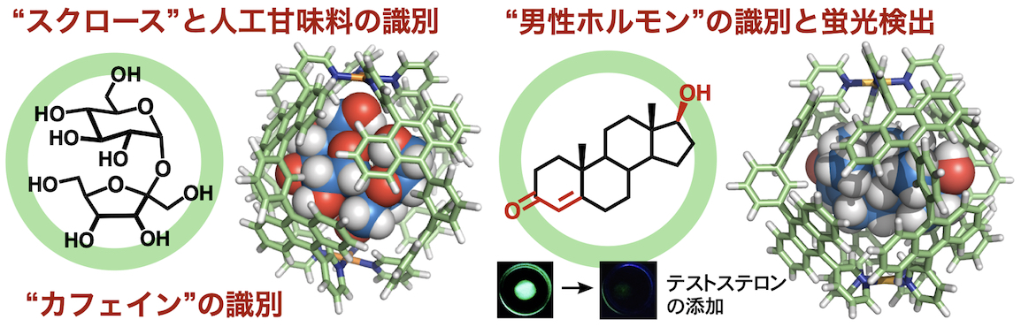 効果的な分子間相互作用により、芳香環ナノ空間内での生体分子の選択的な識別(=センシング)を目指しています。これまでに私達のナノ空間を活用することで、水中・室温で天然糖の混合物から二糖のスクロースを100%の選択性で捕捉できました。また、代表的な男性ホルモンのテストステロンの識別を達成すると共に、その高感度な蛍光検出に成功しました。飲料に含まれるカフェインや生分解性の乳酸オリゴマーも識別できることから、様々な生体必須分子の“高性能センシング”が期待できます。